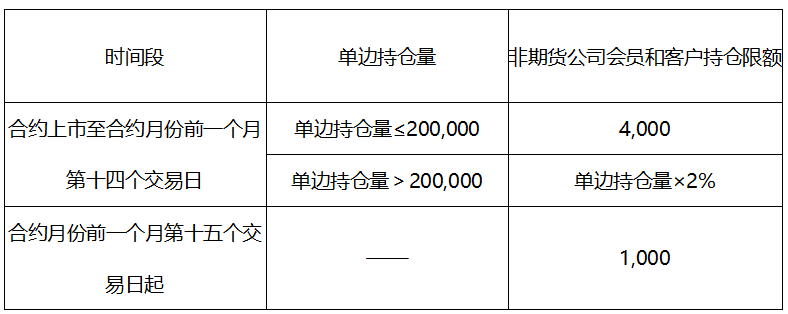 非期货公司会员或者客户在上述期货品种各合约上单日开仓量不得超过其交易限额。该单日开仓量是指非期货公司会员或者客户当日在单个合约上的买开仓数量与卖开仓数量之和。