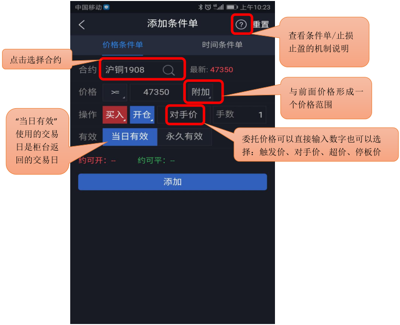 5) 条件单分为价格条件单和时间条件单,价格条件单支持价格区间设置;时间条件单支持时间和价格的双重设置。